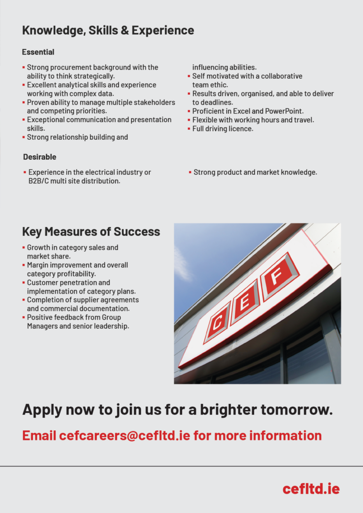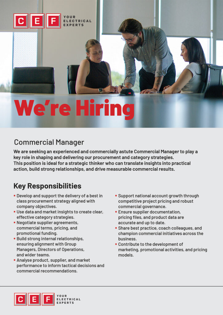 CEF are seeking an experienced and commercially astute Commercial Manager to play a key role in shaping and delivering their procurement and category strategies. This position is ideal for a strategic thinker who can translate insights into practical action, build strong relationships, and drive measurable commercial results. See below….