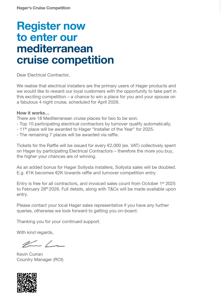 Hager realise that electrical installers are the primary users of Hager products and would, once again, like to reward their loyal customers with the opportunity to take part in this exciting competition – a chance to win a place for you and your spouse on a fabulous 4 night cruise, scheduled for April 2026.